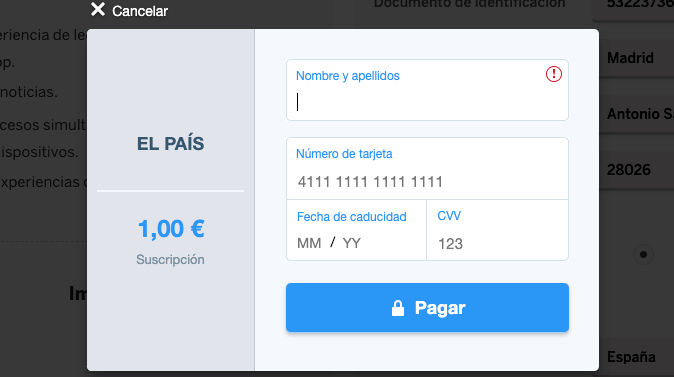 Por último, una vez superados todos estos obstáculos, pequeños para alguien con muchísimo interés en suscribirse pero demasiados para el usuario medio, llegamos al modal que nos solicita la información de la tarjeta. No hay opciones de pago en un clic como paypal o similares y nos vuelve a pedir datos que ya hemos proporcionado (nombre y apellidos), algo que hay que tratar de evitar (y sí, se puede):