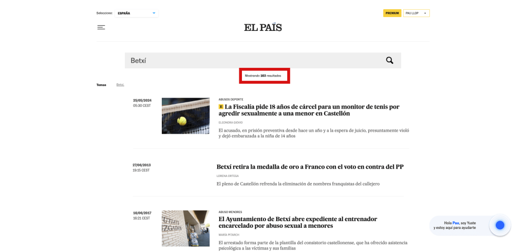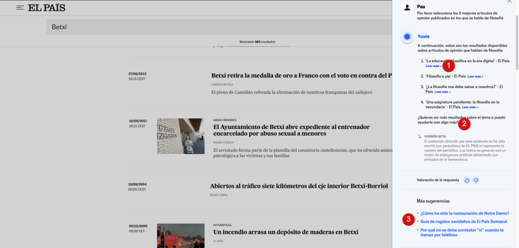 Uno de los pensamientos que me vinieron al ver este formato chatbot flotante fue: ¿tiene sentido en un medio que esto sea algo transversal, como lo es la búsqueda? Por cierto, muchos medios, incluidos El País, tienen esta funcionalidad tan básica bien escondida, y tiene lógica, porque la propuesta de valor de su producto es en gran medida la propuesta editorial, la jerarquización de la actualidad, construyendo así una agenda.