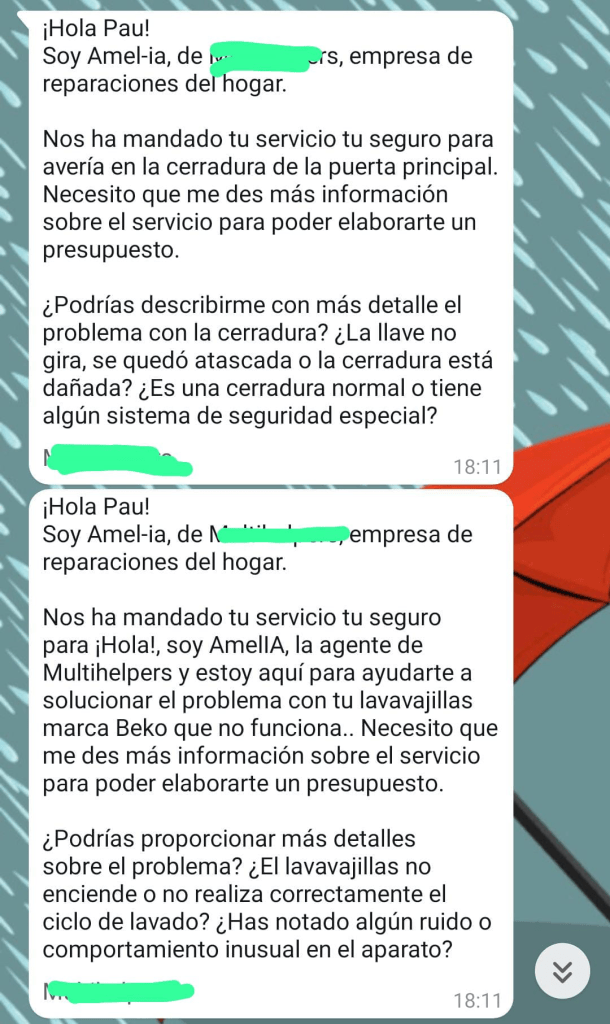 Por lo visto, mi aseguradora deriva estas cosas a una empresa que, a su vez, es una intermediaria entre profesionales autónomos. El problema es que en lugar de una llamada recibo un WhatsApp (sensación de invasión de la intimidad). Bueno, no, recibo dos, uno por cada parte, ambos iguales, incluyendo el saludo (sensación robótica máxima).