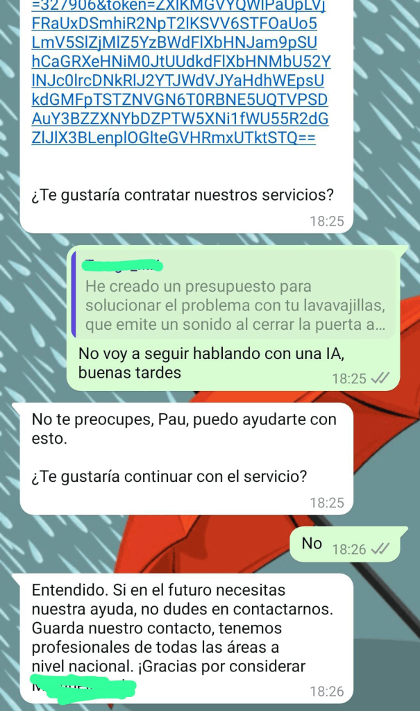 Pero a un coste creo que muy alto: convertir a un cliente potencial casi cautivo en un detractor. Y esto será así mientras sigan existiendo los operadores en la competencia o la IA conversacional esté muchísimo más madura que esto.