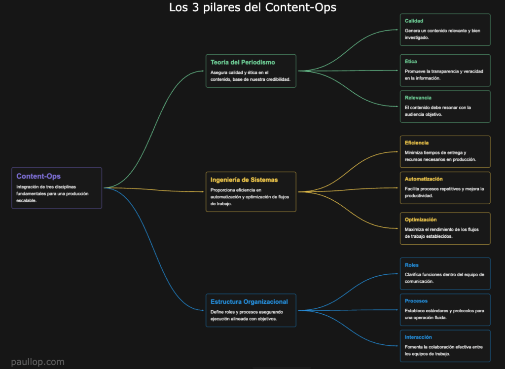 Mi interés sobre el Content-Ops (operaciones de contenido) nace precisamente de ese choque de mundos. La teoría del periodismo —esa que habla de la credibilidad, la transparencia y el foco innegociable en la audiencia— nos señala el valor fundamental de la información. Ese es el qué. Pero mi paso por el producto digital y la arquitectura de información en sectores regulados (banca, pharma, AA.PP, etc.) me enseñó algo: el qué no vale nada si el cómo es ineficiente y no auditable.